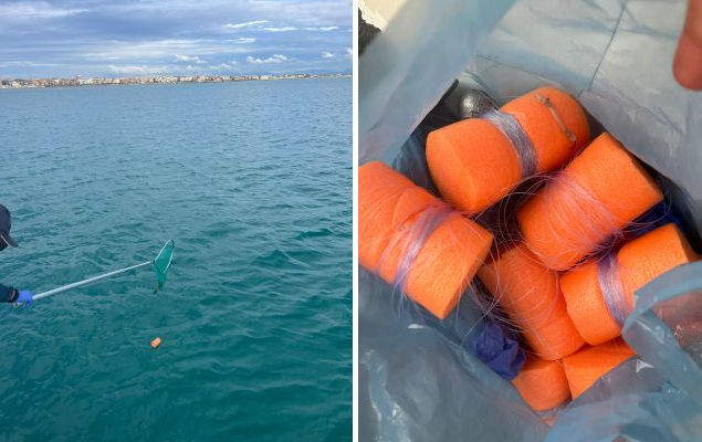 Durante il pattugliamento la motovedetta CP 534, all’altezza del pontile Ravennati di Ostia, ad una distanza di circa 500 metri dalla costa si è imbattuta in una serie di attrezzi da pesca privi dei previsti marchi e segnali, e perciò irregolari oltre che pericolosi per la navigazione. Dieci robuste lenze da almeno venti metri ciascuno e con circa dieci ami per lenza ed altrettante piombature.