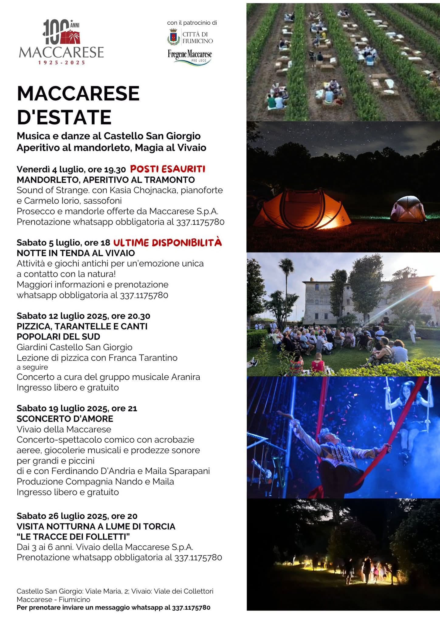 Sempre sabato, alle 21, per la rassegna “Maccarese d’Estate” in scena “Sconcerto d’amore” al Vivaio storico in via dei Collettori, con ingresso libero (consigliato portare un cuscino o una coperta): un concerto-spettacolo comico con acrobazie aeree, giocolerie musicali e prodezze sonore per grandi e piccini di e con Ferdinando D’Andria e Maila Sparapani, con la Produzione della Compagnia Nando e Maila.