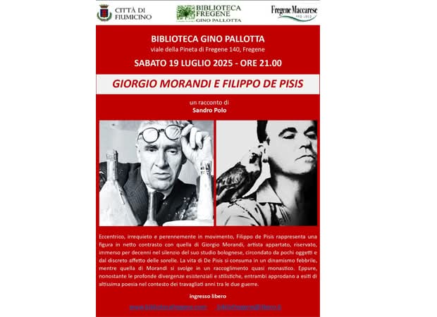 A Fregene, invece, alle 21, nella Biblioteca Gino Pallotta l’ incontro-racconto con lo Storico dell’Arte Sandro Polo sulle figure di Giorgio Morandi e Filippo De Pisis.