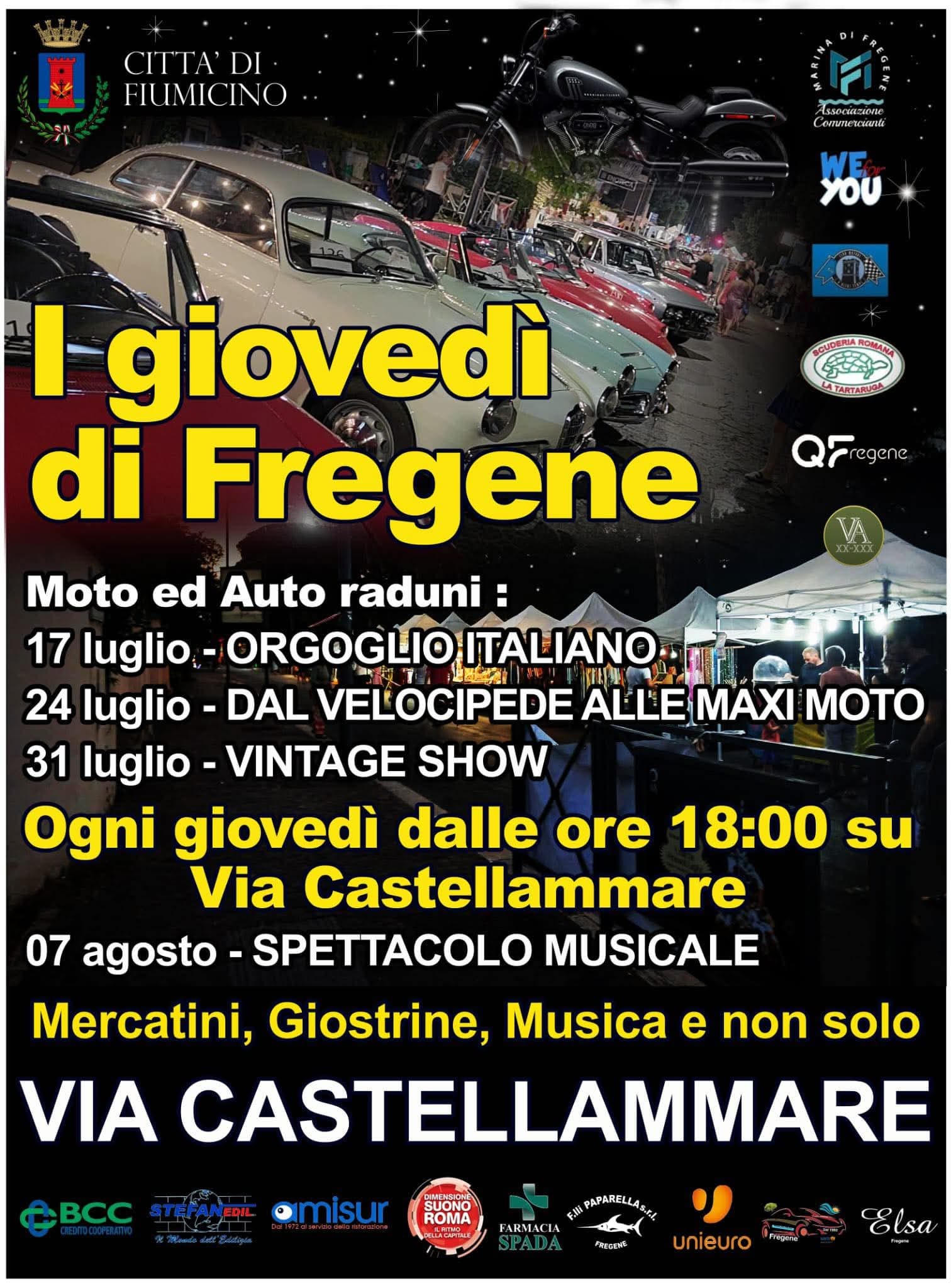 Prosegue domani l’iniziativa “I Giovedì di Fregene“, organizzata dall’Associazione Commercianti Marina di Fregene, con un tratto di via Castellammare isola pedonale e che ospita “Orgoglio Italiano” con auto italiane d’epoca dal 1941 al 1980 , mercatini artigianali, giostre e musica, con l’obiettivo di valorizzare il territorio, promuovere le attività locali e offrire occasioni di socialità e intrattenimento a residenti e turisti.
