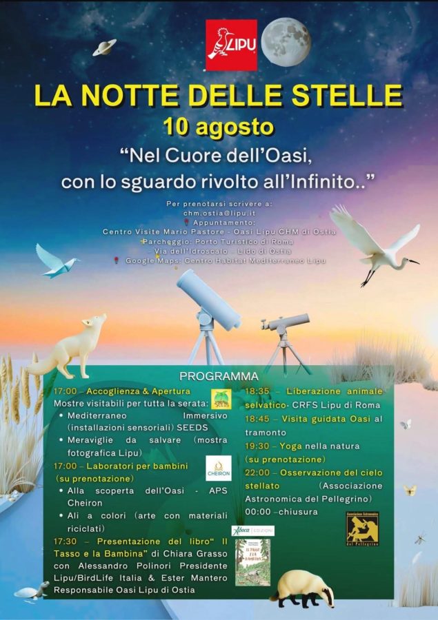 Domenica 10 agosto l’Oasi naturalistica Lipu di Ostia sarà la cornice di uno degli eventi, aperti al pubblico, per “Le Notti delle Stelle“, uno dei quattordici appuntamenti organizzati dall’associazione, fino al 13 agosto, in tutta Italia, per osservare lo spettacolo delle stelle cadenti.