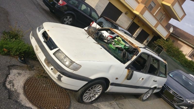 Buongiorno, vorrei segnalare il fatto che la macchina mostrata nelle foto, abbandonata da più di un anno e senza targhe, continua ripetutamente ad essere soggetta di atti di vandalismo (prima i vetri, uno diverso a notte, poi buste della spazzatura, ora addirittura passeggini). Oltre a conferire alla zona un’idea di degrado e abbandono, è anche diventato pericoloso passare durante la notte vicino all’incrocio poiché spesso “baby gang” si divertono a peggiorare ulteriormente le condizioni della macchina.