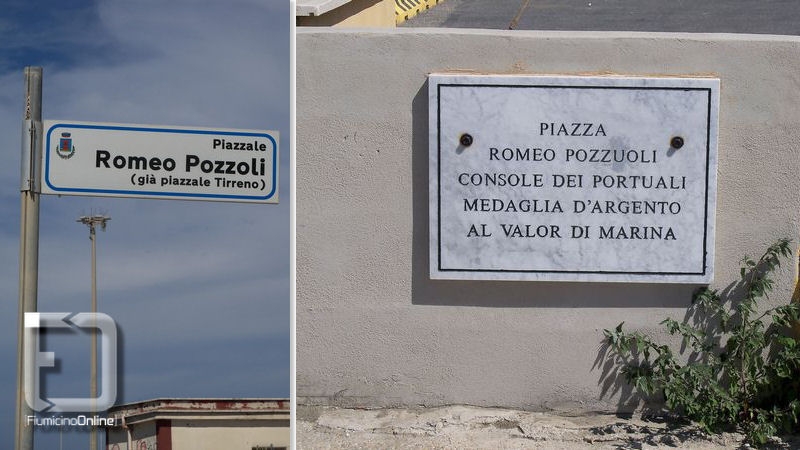 Ci tengo a far presente questo errore perchè Romeo Pozzoli, morto nel 1964, si è valorosamente distinto per aver prestato soccorso all’equipaggio di un piroscafo che, naufragato a largo, stava per affondare. Era infatti il 16 gennaio del 1929, quando il piroscafo “Campidoglio” naufragò a largo delle coste di Fiumicino per un improvvisa tempesta, rischiando di affondare. Il coraggioso Romeo Pozzoli, che all’epoca dei fatti aveva 24 anni, dalla spiaggia si avventurò, insieme a Enrico Molinari, su di un battello per recare soccorso all’equipaggio della motonave in avaria. Sfidando la furia della tempesta e dopo il secondo tentativo di soccorso i due eroi riuscirono a salvare i malcapitati naufraghi, riportandoli a riva. Proprio per il gesto di eroismo compiuto, a Romeo Pozzoli e Enrico Molinari fu assegnata il 2 Maggio del 1930 dall’allora Ministero della Marina, di nomina regia, la Medaglia d’Argento al valor di Marina, con la seguente motivazione: ‘Per aver, con ripetuti tentativi e con manifesto rischio della vita, cooperato in massima parte al salvataggio di sei persone appartenenti all’equipaggio del piroscafo Campidoglio gettato dalla tempesta sulla spiaggia, le quali correvano imminente pericolo di essere asportate dal mare.” (Fiumicino, 16 gennaio 1929)’ Anche la “Fondazione Carnegie per gli atti di eroismo” nel giugno 1930 conferì ai due uomini la medaglia d’argento per il valoroso atto compiuto”. L’Amministrazione comunale, guidata da Canapini decise di dedicare loro, proprio davanti al mare che li ha resi eroici protagonisti della storia del territorio i loro nomi per essere ricordati da tutti noi concittadini, per rendere simbolicamente omaggio alla loro memoria e al loro intrepido gesto di umanità.