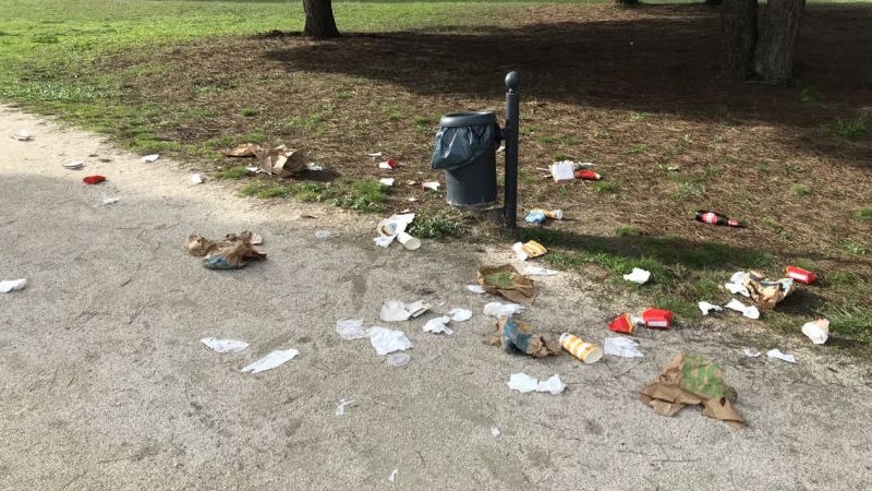 I rifiuti dispersi nel parco sono per la maggior parte i resti di picnic fatti nelle vicinanze di panchine e poi abbandonati (vedi foto scattata ieri).