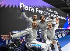 Dopo il bronzo ieri nell’individuale Categoria A, brilla d’Oro oggi la sciabola di Edoardo Giordan nel Campionato del Mondo di scherma paralimpica Iksan 2025. Come gli sciabolatori della scherma olimpica un mese fa a Tbilisi, l’Italia è campione del mondo anche nella sciabola maschile paralimpica, trionfando nella prova a squadre di Iksan 2025. Un oro storico quello conquistato dall’atleta di Fiumicino, Edoardo Giordan, assieme ai compagni Mattia Galvagno, Gianmarco Paolucci e Andrea Jacquier che in semifinale hanno battuto – non era mai accaduto in passato – la corazzata Cina per 45-44 e in finale, con lo stesso punteggio, sempre all’ultima stoccata, hanno superato anche l’Ucraina facemmo risuonare le note dell’Inno di Mameli al Mondiale in Corea del Sud.