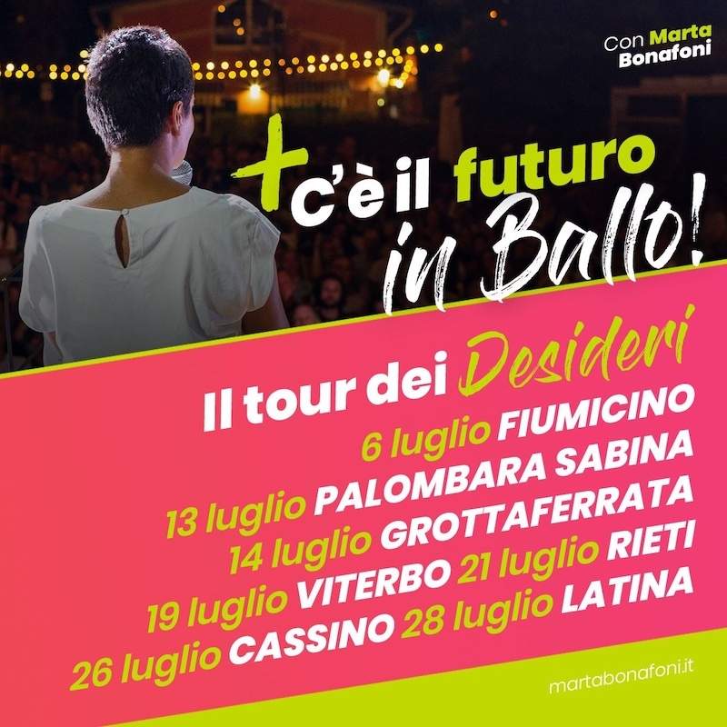 All’insegna dello slogan “C’è il futuro in Ballo!”, sarà al via ufficialmente mercoledì 6 luglio, da Fiumicino, il “Tour dei Desideri”, un viaggio nelle città e nei territori delle cinque province della Regione Lazio. Lo rende noto la consigliera regionale Marta Bonafoni. L’appuntamento è alle 18 presso il porticciolo Il Faro.