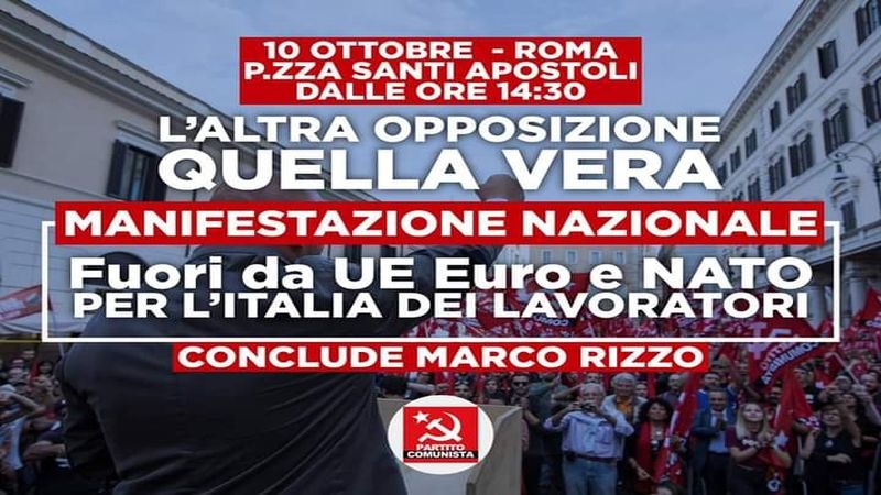 Sabato 10 ottobre alle ore 14.30 il Partito Comunista sarà in piazza Santi Apostoli con la manifestazione nazionale “Fuori da UE Euro e Nato per l’Italia dei lavoratori”.