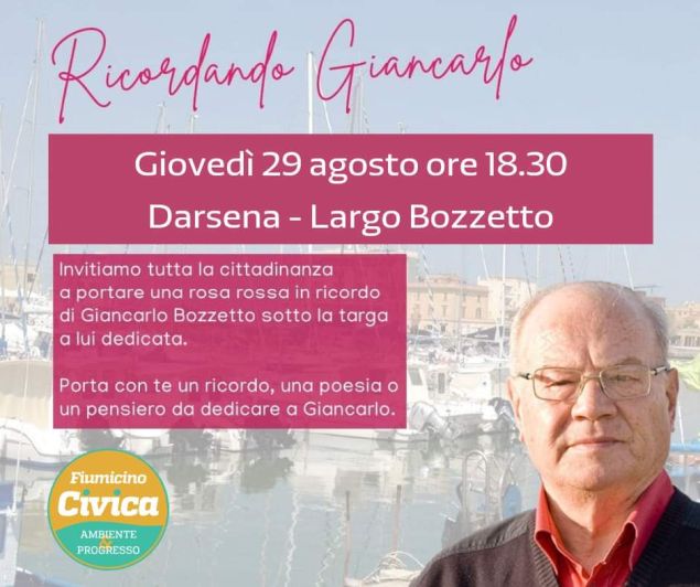 “Ricordando Giancarlo”. In occasione del 14° anniversario della scomparsa del sindaco Giancarlo Bozzetto, giovedi 29 agosto alle ore 18.30, ci sarà una commemorazione pubblica, organizzata dalla Lista Fiumicino Civica – Ezio, presso Largo Bozzetto, nella Darsena, per onorare la sua memoria.