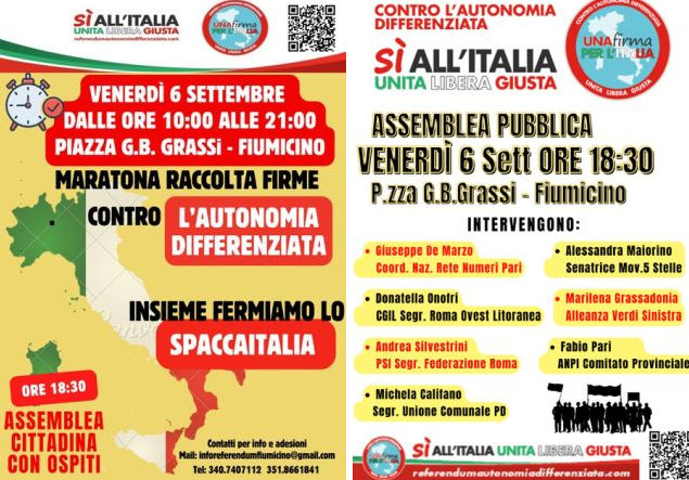 Venerdì 6 settembre, dalle ore 10:00 alle 21:00, si terrà a Fiumicino, in Piazza G.B. Grassi, una Maratona Raccolta Firma organizzata dal Comitato fiumicinense, per difendere l’uguaglianza dei diritti e opporsi fermamente al progetto del cosiddetto “spacca Italia”.