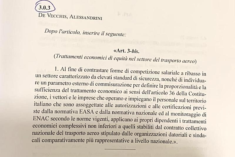 “Ricordo, inoltre – conclude il Senatore – che nell’ articolo 203 del Decreto Rilancio del 2020 si cita espressamente che i lavoratori del settore aereo in servizio come base in Italia, ai sensi del regolamento (UE) n.965/2012 della Commissione del 5 ottobre 2012, abbiano trattamenti retribuiti non inferiori a quelli minimi stabiliti dal Contratto Collettivo Nazionale del settore stipulato dalle organizzazioni sindacali e datoriali comparativamente più rappresentative a livello nazionale.”