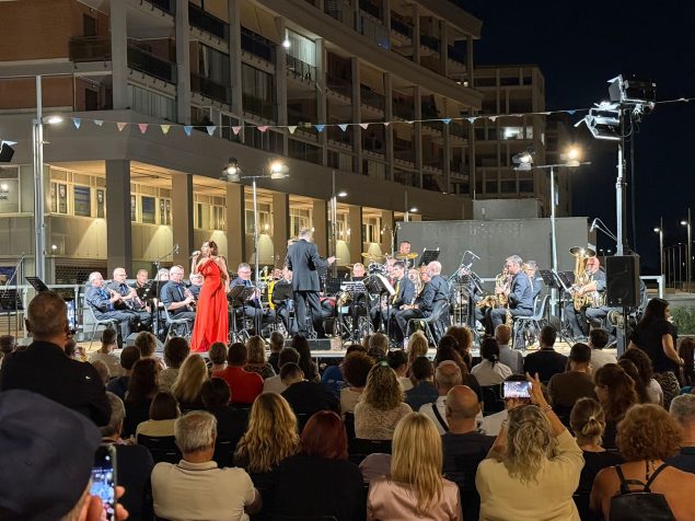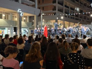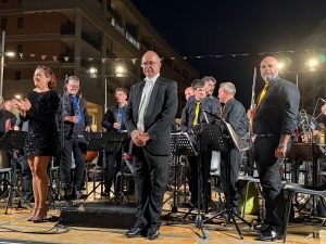 Protagonista dell’evento è stata la B-And Wind Orchestra, diretta dal Maestro Gian Luca Cantarini, riconosciuto a livello nazionale per la sua versatilità nella direzione e scrittura per orchestra di fiati. L’ensemble, composto da 36 musicisti, ha saputo incantare il pubblico con un repertorio raffinato e coinvolgente che ha spaziato tra swing, jazz, celebri colonne sonore del Maestro Ennio Morricone e i tanghi appassionati di Astor Piazzolla. A rendere ancora più suggestiva la performance, la voce intensa e raffinata della cantante Anna Ragozzino, che ha emozionato i presenti con le sue interpretazioni. Particolare soddisfazione è stata espressa dal Maestro Cantarini per l’ottima acustica naturale della piazza.
