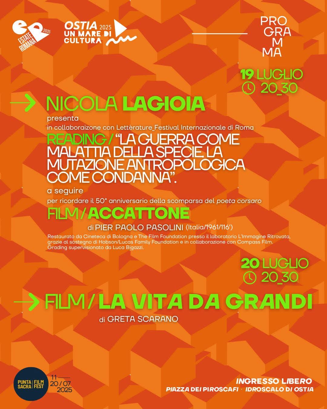 Torna il grande cinema estivo all’Idroscalo di Ostia per la quarta edizione del “PUNTASACRA FILM FEST 2025“: in Piazza dei Piroscafi dall’11 al 20 luglio con ingresso gratuito.