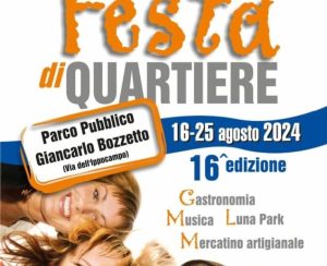 Proseguirà fino a domenica 25 agosto la sedicesima edizione della “Festa di Quartiere”, organizzata dall’Associazione Comprensorio Pesce Luna presso il Parco Pubblico “Giancarlo Bozzetto” di Via dell’Ippocampo, a Fiumicino. La festa, che si sta svolgendo all’interno del parco, prevede ogni sera prelibati stand gastronomici, musica e balli, un luna park per i bambini ed un mercatino artigianale.