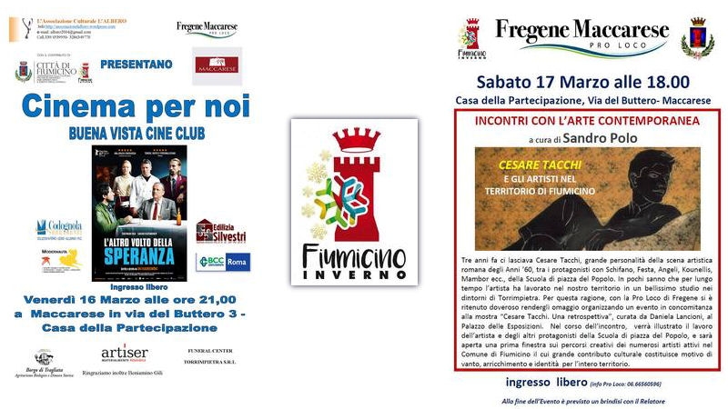 Venerdì 16 marzo alle ore 21 appuntamento presso la Casa della Partecipazione di Maccarese per la proiezione gratuita del film “L’altro volto della speranza” di Aki Kaurismäki a cura dell’Associazione culturale L’albero. Sempre la Casa della Partecipazione ospiterà sabato 17 marzo alle ore 18 l’incontro con l’arte contemporanea a cura di Sandro Polo, organizzato dalla Pro loco di Fregene/Maccarese. Si parlerà di Cesare Tacchi e degli artisti nel territorio di Fiumicino.