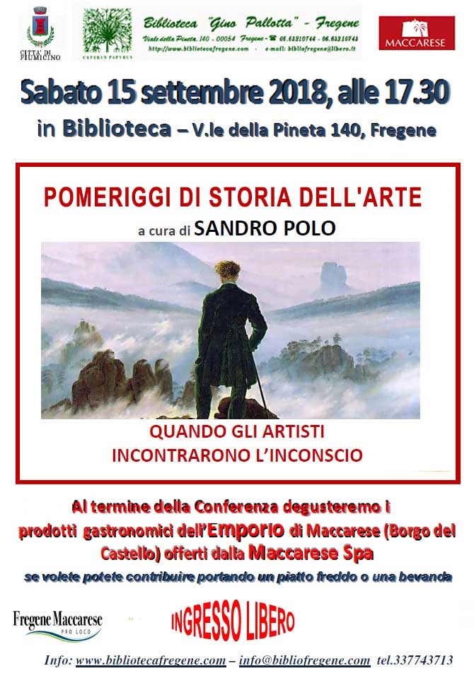 Sabato 15 settembre alle ore 17.30 presso la Biblioteca Gino Pallota a Fregene, un imperdibile evento di storia dell’Arte condotto da Sandro Polo. Counselor professionista, storico dell’Arte specializzato in Arte Contemporanea, docente di Arte e Psicologia presso il Centro Italiano Gestalt di Roma, già nelle scorse conferenze è riuscito a suscitare forte interesse e curiosità tra i partecipanti.