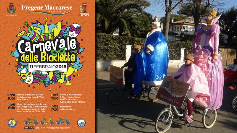 Domenica 11 febbraio 2018, su iniziativa della Pro Loco di Fregene e Maccarese, appuntamento a Fregene con la quinta edizione del Carnevale delle Biciclette: uno dei carnevali più originali organizzati in Italia perché propone l’incentivazione dell’uso della bicicletta e di altri mezzi di trasporto ecologici ed anti inquinamento. Chiunque lo desiderasse, potrà iscriversi alla gara dalle ore 14.