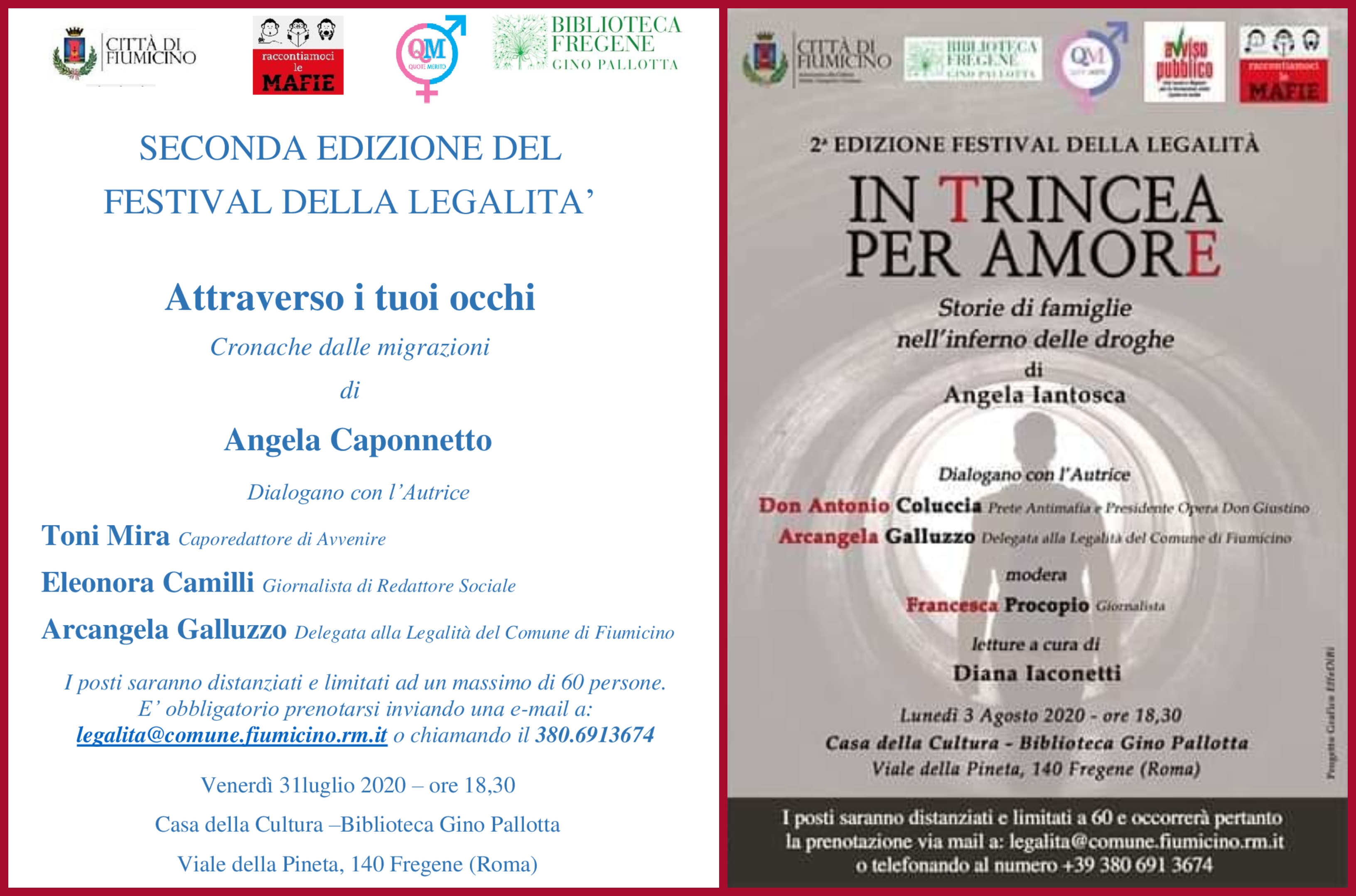 Gli incontri avverranno all’aperto, nel giardino della casa della cultura e, nel rispetto delle norme di sicurezza previste, i posti saranno distanziati e limitati ad un massimo di 60 persone. È necessario prenotarsi inviando una mail a legalita@comune.fiumicino.rm.it o chiamando il numero 380.6913674.