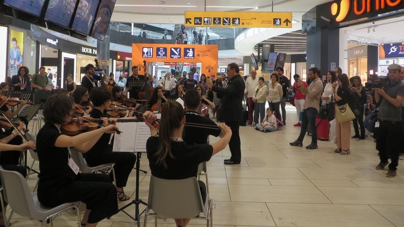 I giovani talenti della Youth Orchestra del Teatro – musicisti provenienti da ogni parte di Italia – hanno interpretato, in quest’occasione diretti dal maestro Roberto De Maio, pagine strumentali tratte dalle maggiori opere liriche: l’introduzione dal Rigoletto di Verdi, l’ouverture dal Don Giovanni di Mozart e la sinfonia da Il barbiere di Siviglia di Rossini. Nelle due aree di imbarco sono stati allestite 27 sedute dove, con grande stupore dei passeggeri presenti, violini, contrabbassi, timpani e piatti hanno suonato in un teatro operistico improvvisato tra i gate di imbarco e fuori dal contesto abituale delle sale da concerto dell’Opera, considerata, in molti Paesi del mondo, un emblema dell’italianità.