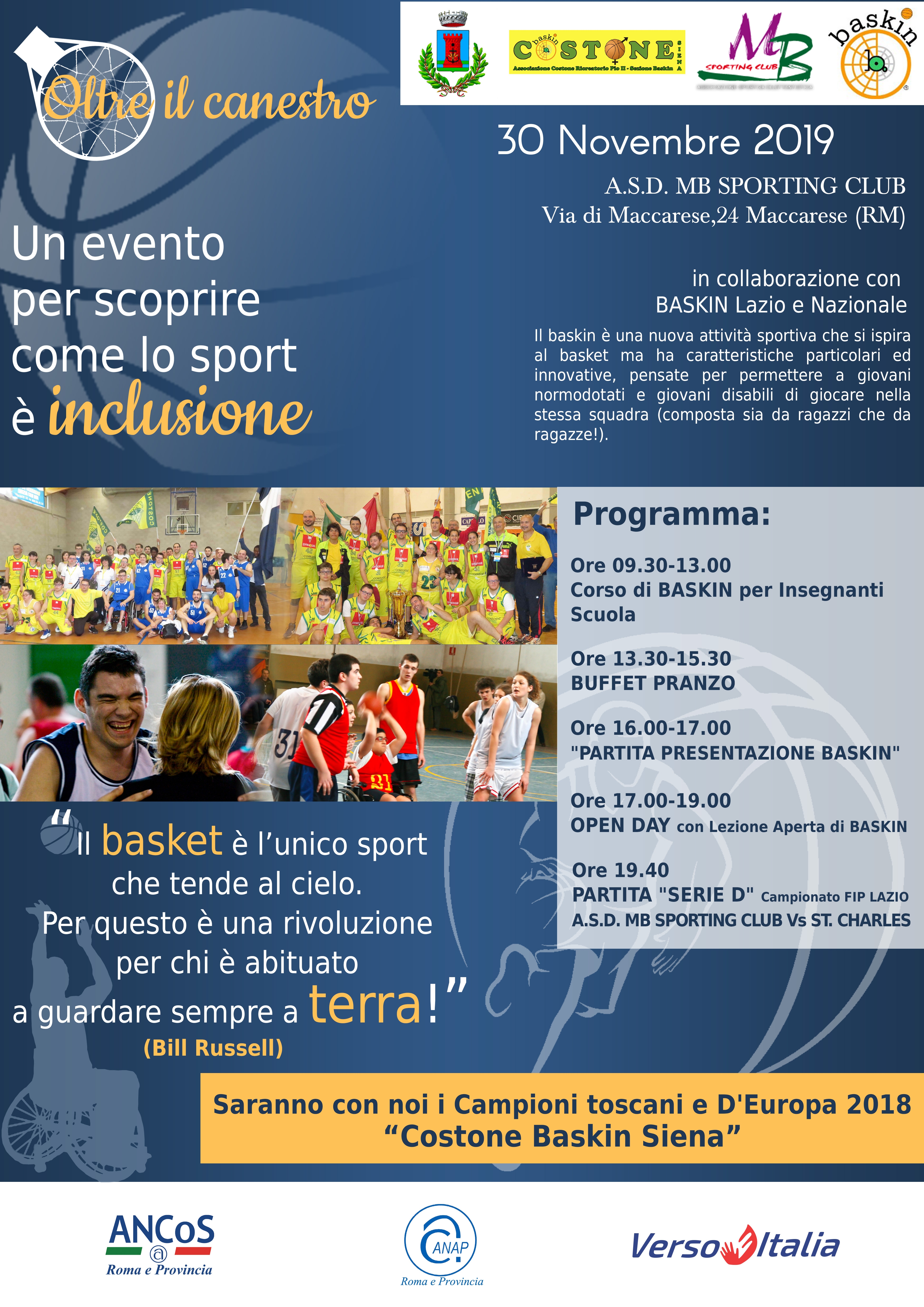 La giornata è organizzata dall’associazione Asd MB Sporting Club, con la collaborazione del laboratorio civico Ripartiamo da Noi, con il sostegno Baskin Lazio e nazionale e con il patrocinio del Comune di Fiumicino.