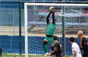 Il match si apre con un legno colpito da Nuti. Risponde l’esperto Toscano che aggancia bene in area e al volo batte a rete dove vola De Clementi che respinge la sfera. Al quarto d’ora ci prova Fagioli con un diagonale intercettato senza difficoltà da Sorcini. Al 27’, ci prova Bevilacqua con una conclusione messa in angolo dell’estremo difensore locale. Alla mezz’ora, prodezza di Sorcini (vedi foto) che si oppone a un diagonale dell’attivo Fagioli.