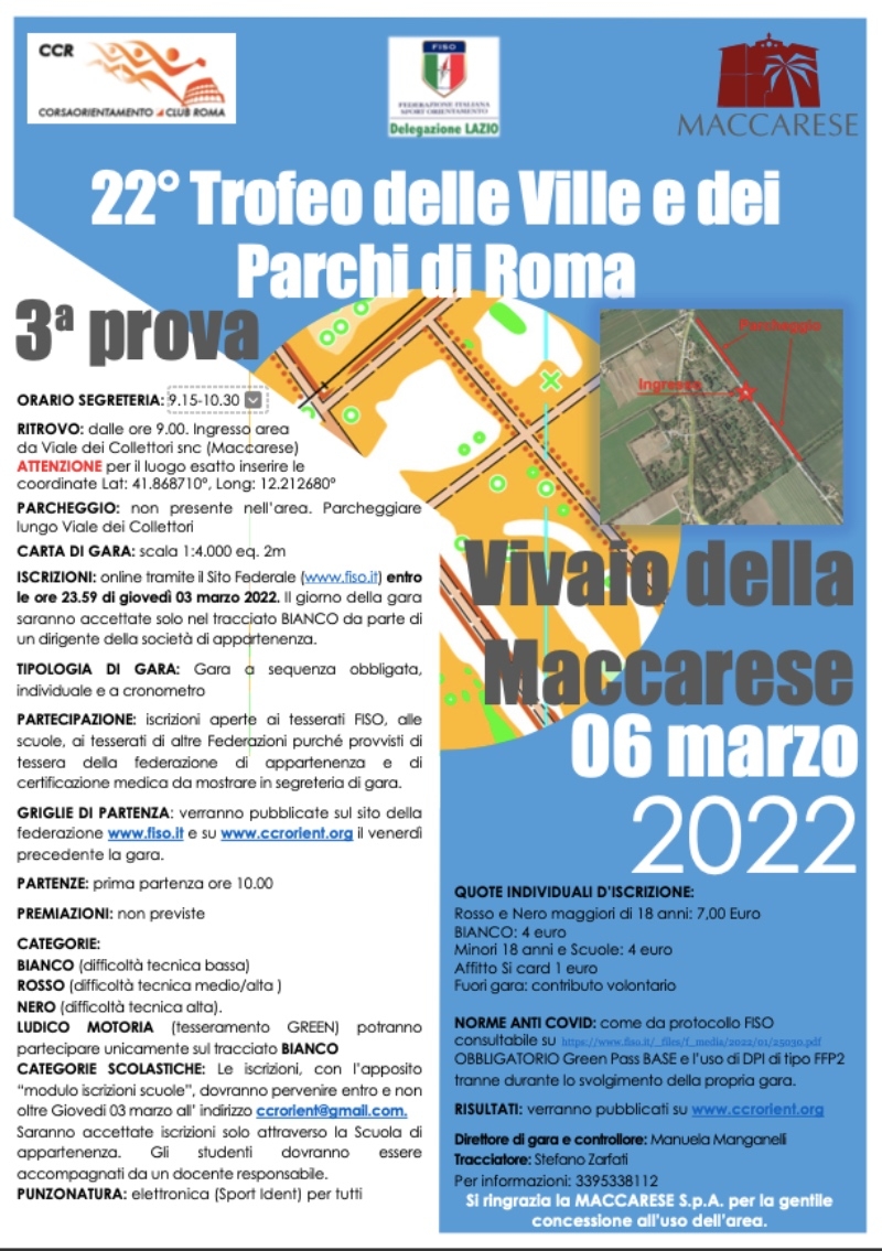 Con gare di Orienteering, il “Vivaio” della Maccarese spa, area naturalistica di alto valore ambientale, apre in via straordinaria di nuovo le sue porte ad attività sportive e per il tempo libero. Nei suoi 33 ettari, con pinete ed ambienti umidi, spazi rettangolari delimitati da strade campestri e filari di piante ornamentali ed arboree che ricordano quello che, fino agli anni ’70, fu il grande vivaio di Roma, domenica 6 marzo ospita il 22esimo “Trofeo delle Ville e dei Parchi di Roma – Terza prova Vivaio della Maccarese“.