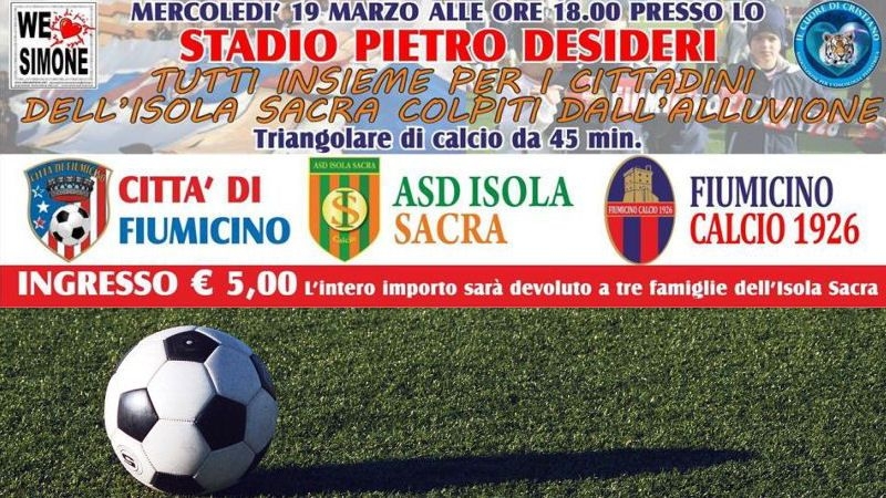Fiumicino Calcio, Isola Sacra, Città di Fiumicino. Tutte e tre in campo per aiutare le famiglie colpite dall’alluvione dello scorso febbraio. Sport e solidarietà insieme. Uno spettacolo. Mercoledì 19 Marzo ore 18 stadio Pietro Desideri. Tre derby, quarantacinque minuti a partita. Qui non conta chi vince, conta solo fare il pienone, acquistare un biglietto (5 euro il costo) e partecipare in massa. Tutto il ricavato andrà in beneficenza.