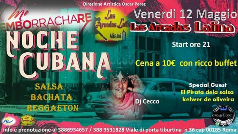 Per la prima volta la Oscar Biondi Events presenta a Roma la Noche Cubana, una serata ricca di salsa, bachata, reggaeton il tutto condito da uno dei dj più in voga della capitale Dj Cecco. Ospiti della serata, inoltre, la scuola di danza del maestro Kelwer de Oliveira di cui sarà special guest El Pirata de la Salsa.