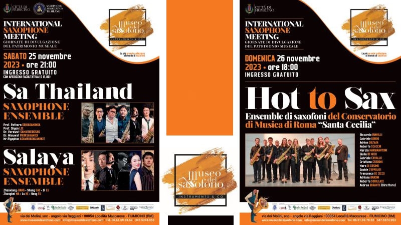 Sabato 25 e domenica 26 novembre, al Museo del Saxofono di Fiumicino, è in programma l’INTERNATIONAL SAXOPHONE MEETING, un evento internazionale che vedrà protagonisti artisti provenienti da Thailandia, Taiwan, Cina e Italia, tutti accomunati dalla passione per il saxofono. Due giornate di divulgazione del patrimonio museale durante le quali si esibiranno rispettivamente il SA THAILAND SAXOPHONE ENSEMBLE (Thailandia) e il SALAYA SAXOPHONE ENSEMBLE (Cina) – sabato a partire dalle ore 21:00 – e l’HOT TO SAX (Italia) – domenica, alle ore 18:00. L’ingresso è libero a tutti, fino ad esaurimento posti.