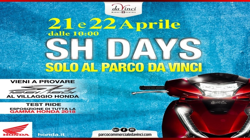 Il prossimo fine settimana, sabato 21 e domenica 22 aprile, dalle ore 10 il Da Vinci ospita la seconda edizione di SH Days. All’interno del Parco sarà allestito un villaggio Honda con tutta la gamma 2018 e sarà possibile effettuare test ride per conoscere la qualità dei prodotti Honda.