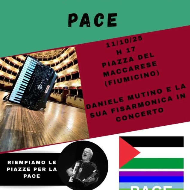 Sabato 11 ottobre, alle 17, in Piazza del Maccarese, si terrà l’evento, gratuito e aperto a tutti, “Artisti per la Pace”, con Daniele Mutino e la sua fisarmonica. L’appuntamento, parte dell’iniziativa “Riempiamo le piazze contro gli orrori in Palestina e per una pace duratura nel mondo intero”, vuole essere un momento di riflessione e di speranza per una risoluzione pacifica dei conflitti globali.