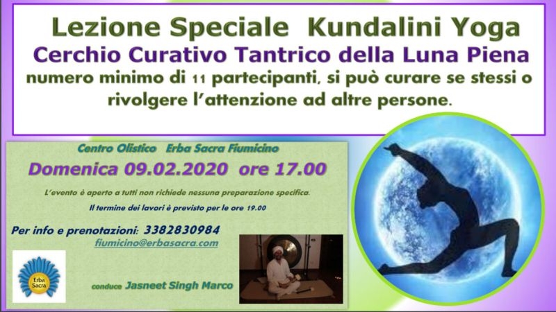 Domenica 9 febbraio alle ore 17.00, al Centro Olistico Erba Sacra Fiumicino, in via passo Buole 117 “LEZIONE SPECIALE KUNDALINI YOGA – CERCHIO CURATIVO TANTRICO DELLA LUNA PIENA” Conduce Jasneet Singh Marco