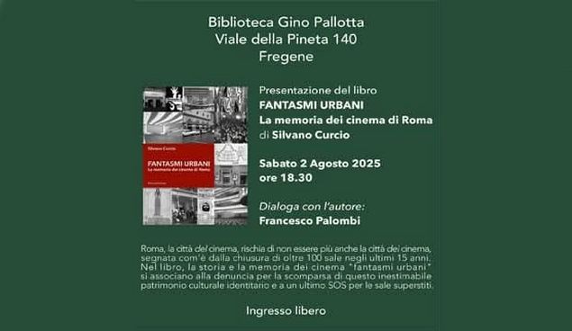 Ancora un’iniziativa culturale presso la Biblioteca Gino Pallotta di Fregene: sabato 2 agosto, alle 18.30, ci sarà la presentazione del libro “Fantasmi urbani – La memoria dei cinema di Roma” di Silvano Curcio. Francesco Palombi dialogherà con l’autore.