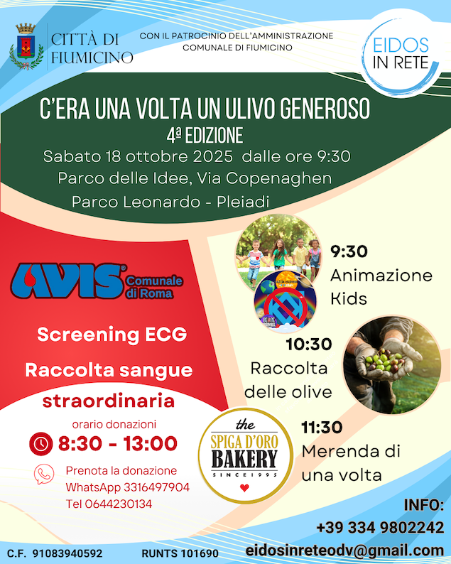 Con il patrocinio dell’Amministrazione comunale di Fiumicino, sabato 18 ottobre 2025, a partire dalle ore 9:30, si terrà presso il Parco delle Idee, in Via Copenaghen a Parco Leonardo, la quarta edizione dell’evento “C’era una volta un ulivo generoso“, promosso dall’associazione Eidos in Rete.