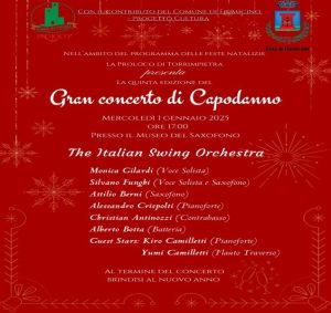 MACCARESE E sempre alle 17, su iniziativa della Pro Loco di Torrimpietra e con il patrocinio comunale (Progetto Cultura), il 2025 inizierà con la quinta edizione del “Gran Concerto di Capodanno” nel Museo del Saxofono a Maccarese: in scena “the Italian Swing Orchestra”, con guest stars, Kiro e Yumi Camilletti. Al termine il Brindisi al nuovo anno.