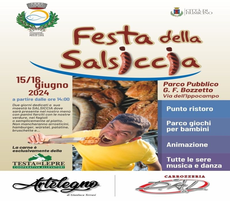Sabato 15 e domenica 16 giugno a partire dalle ore 14, presso il Parco pubblico G.F. Bozzetto Via dell’Ippocampo a Fiumicino, torna l’Associazione Comprensorio Pesce Luna con due giorni dedicati a sua maestà la SALSICCIA (così recita la locandina).