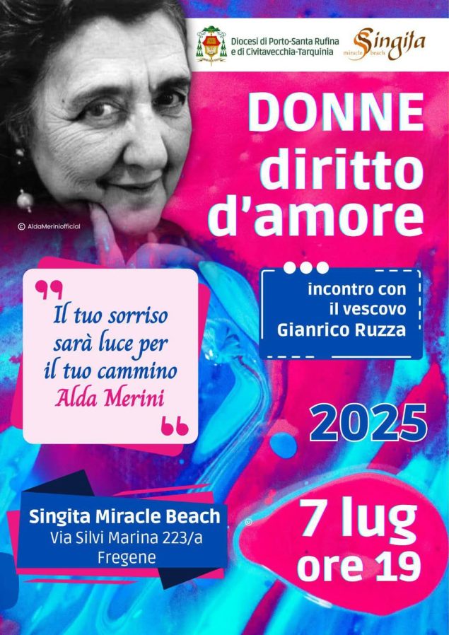 “Donne, diritto d’amore“: è l’incontro dedicato e riservato al mondo femminile, in programma lunedì 7 luglio, alle 19, al Singita Miracle Beach, al Villaggio dei pescatori a Fregene. “Accogliendo anche quest’anno il desiderio di alcune di voi – scrive il vescovo Gianrico Ruzza nella lettera d’invito – le nostre Chiese di Porto-Santa Rufina e di Civitavecchia- Tarquinia propongono la terza edizione del dialogo che vede voi tutte come protagoniste, siate credenti o non credenti, praticanti o meno”.