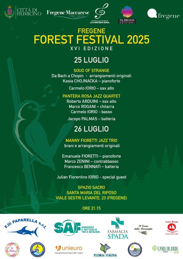 Torna uno degli appuntamenti culturali più tradizionali ed immancabili dell’estate sul territorio: domani e sabato 26 luglio la 16esima edizione del “FREGENE FOREST FESTIVAL 2025”, a cura della Scuola di musica La Pantera Rosa.