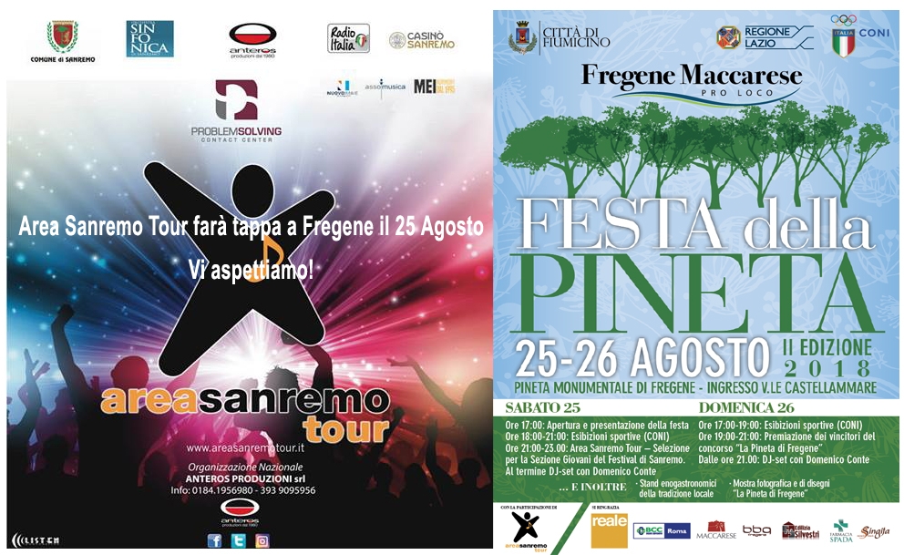 Fregene sarà una delle tappe dove si svolgeranno le selezioni nazionali per il Festival di Sanremo 2019. Per la prima volta, le selezioni di “Area Sanremo Tour” si svolgeranno anche a Fregene, durante la Festa della Pineta. Ospitare questo importante appuntamento è per Fregene una grande occasione, che qualificherà ulteriormente l’offerta della nostra città nel periodo estivo.