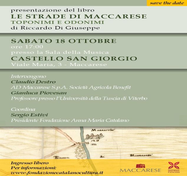 Sabato 18 ottobre la Sala della Musica del Castello San Giorgio di Maccarese, alle ore 17, ospiterà l’anteprima della presentazione del libro “Le strade di Maccarese – Toponimi e odonimi” a cura del naturalista Riccardo Di Giuseppe.