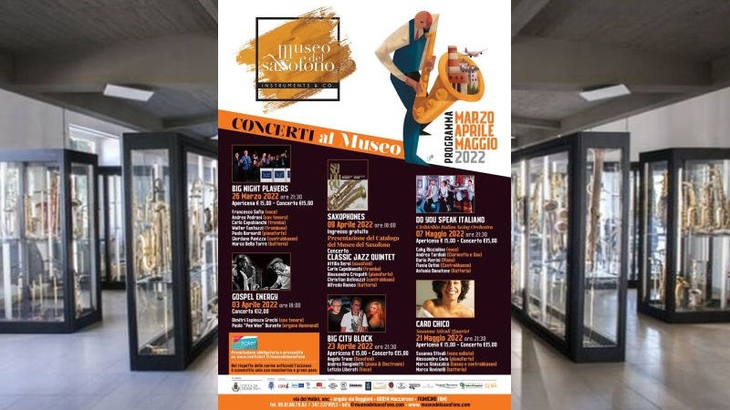 Riprendono con la primavera, al Museo del Saxofono di Maccarese, i concerti settimanali della stagione 2022.Una grande e doppia opportunità, per chi non conosce ancora questo giovane spazio espositivo, che oltre a proporre musica di grande qualità con interpreti di assoluto spessore, offre la possibilità di ammirare da vicino la collezione di saxofoni più grande del mondo.