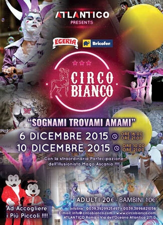 Sarà la Compagnia del Circo Bianco protagonista di due appuntamenti in scena all’ATLANTICO di Roma.  Si comincia DOMENICA 6 DICEMBRE con due spettacoli, alle ore 16.00 e alle ore 21.00, a cui seguirà un’unica altra data, GIOVEDÌ 10 DICEMBRE, con un primo spettacolo riservato alle scuole che avrà inizio alle ore 10:00 e l’ultimo appuntamento per la sera alle ore 21:00, che vedrà in scena artisti, trampolieri, acrobati e performer di ogni genere.