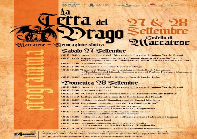 In scena, su iniziativa della Pro Loco Fregene e Maccarese e Freemac, la prima edizione della rievocazione storica della leggenda de “La Terra del Drago”. In agenda spettacoli teatrali e cortei storici, musiche, letture e danze medievali; ed ancora esibizioni di arcieri, sbandieratori e falconieri, artisti di strada, mangia fuoco, giocolieri, Taverne ed aree food per banchetti, dj set.