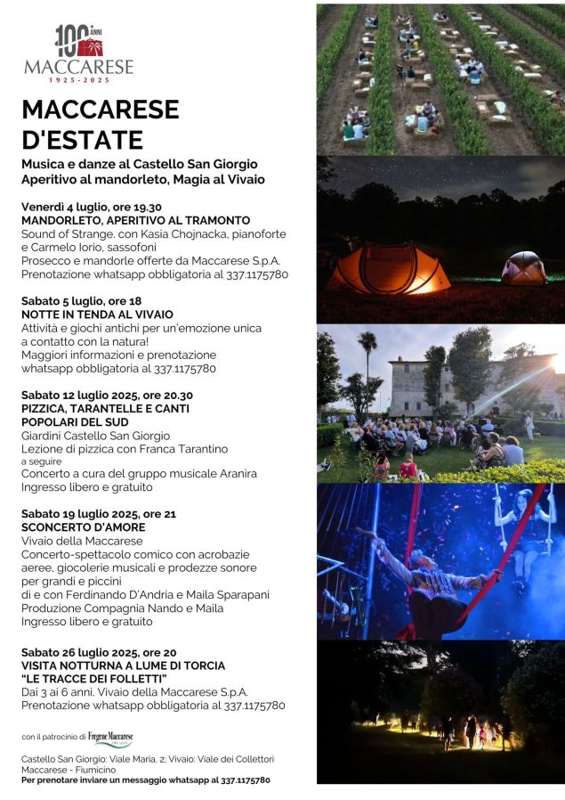 Entrano nel vivo gli appuntamenti culturali e ricreativi sul territorio di Fiumicino anche con gli appuntamenti, fino al 26 luglio, di “Maccarese d’Estate 2025”, la rassegna proposta dalla Maccarese S.p.A. In agenda, tra l’altro, musica e danze al Castello San Giorgio, aperitivo al mandorleto, magia ed attività notturne speciali per famiglie e bambini al Vivaio della Maccarese, l’area verde lungo viale di Porto e via dei Collettori.