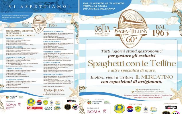 “Per i Sessant’anni della Sagra abbiamo preparato una programmazione ricca e variegata per tutti i gusti e le età – sottolinea Massimo De Fazio, uno degli Organizzatori della Sagra – La stagione è stata finora molto generosa in termini di raccolta di telline e promette ancora benissimo, grazie anche alla misura del fermo biologico ed all’impegno dei pescatori certificati. La manifestazione è un’occasione per riscoprire le tradizioni e la cultura del territorio di Ostia e per trascorrere momenti di gioia e convivialità insieme alla comunità”.