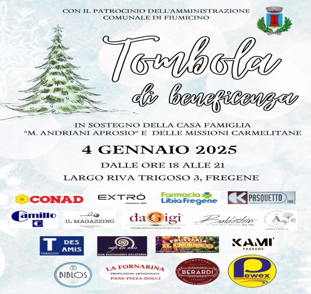 Ancora un’iniziativa all’insegna della solidarietà durante le festività sul territorio comunale di Fiumicino. Il 4 gennaio, a Fregene, dalle 18 alle 21, è in programma la “Tombola di Beneficenza” presso la Casa Famiglia Maria Adriani Aprosio, in Largo Riva Trigoso 3. Il ricavato sarà destinato a sostegno della stessa Casa Famiglia e delle Missioni Carmelitane.