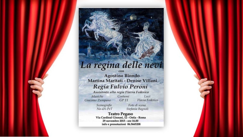 Domenica 29 novembre alle ore 16.00 la Nova Accademia presenta “La regina delle nevi” di H.C. Andersen – Adattamento e regia di Fulvio Peroni. Con: Agostino Biondo, Martina Maritati, Denise Villani. Aiuto regia: Flavia Federico. Regia: Fulvio Peroni.