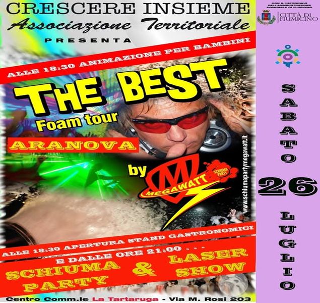 L’Associazione Crescere Insieme, con il patrocinio del Comune di Fiumicino, organizza per la serata di sabato 26 Luglio, l’evento “The Best Foam Tour Schiuma Party e Laser Show”, una manifestazione gratuita e aperta a tutta la cittadinanza.