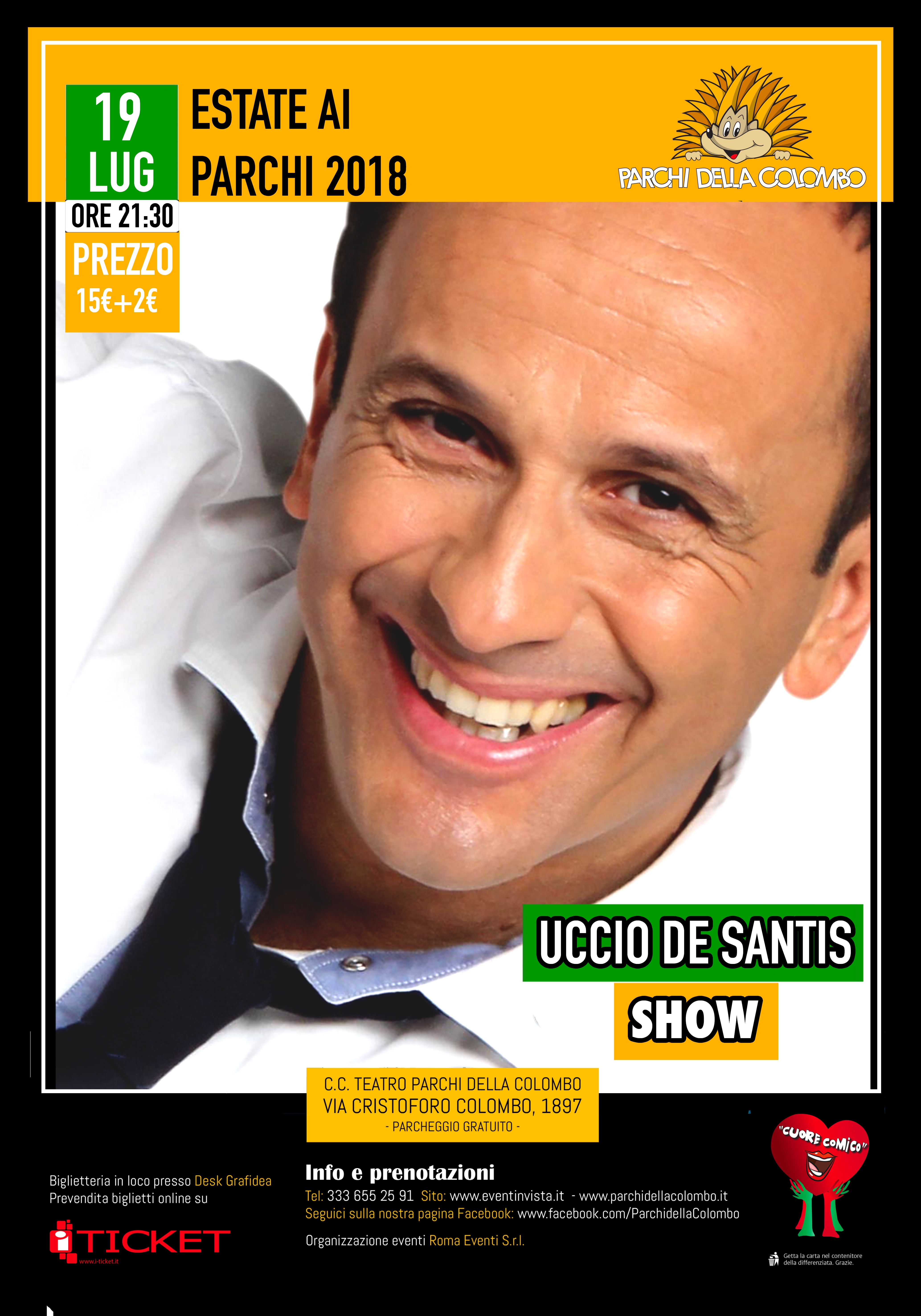 Uccio De Santis Show approderà ai Parchi della Colombo il giorno 19 luglio alle ore 21:30 come un vero e proprio showman, regalando al suo calorosissimo pubblico una serie di battute esilaranti, riflessioni e durante la quale il comico pugliese assicurerà una “valanga di risate” e tanto tanto show!
