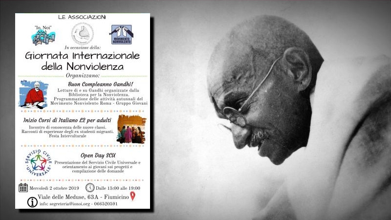 In occasione del 2 ottobre, 150° dalla nascita di Gandhi e Giornata internazionale Onu della nonviolenza, il Movimento Nonviolento Roma in collaborazione con la Biblioteca per la Nonviolenza e l’Associazione di volontariato “Io, Noi” organizzano Buon compleanno Gandhi! con letture, video, note biografiche per incontrare il Mahatma Gandhi, per presentare e fare conoscere la nonviolenza a chi ne ha scarsa conoscenza, e in particolare ai giovani.