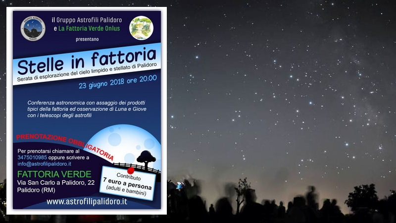 Sabato 23 giugno 2018 presso la Fattoria Verde a Palidoro, il Gruppo Astrofili Palidoro installerà i loro telescopi per una serata di osservazione. L’evento avrà inizio alle ore 20.00 con una conferenza di spiegazione del pianeta Giove e della Luna tenuta dall’astrofilo Giuseppe Conzo.
